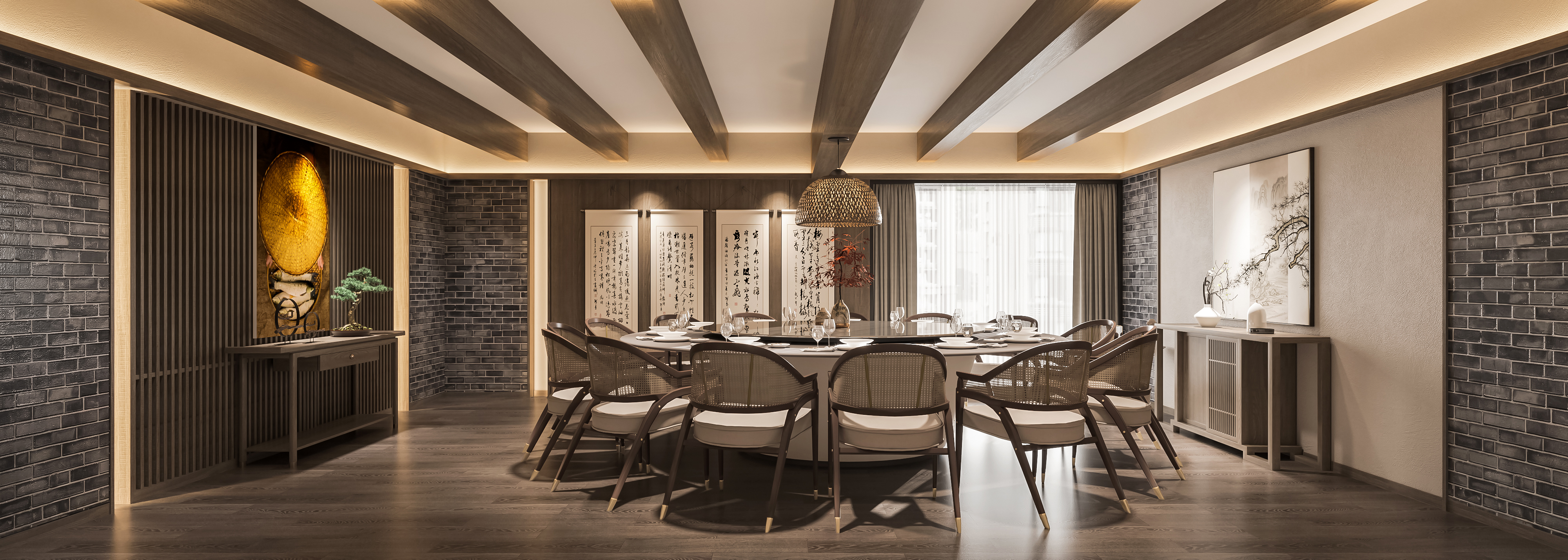 通(tōng)過有做(zuò)舊(jiù)感的(de)竹編屏風來(lái)切分(fēn)餐廳功能區(qū)域,增加空間層次感的(de)同時(shí)也(yě)增加了(le)空間的(de)質樸之美(měi)。