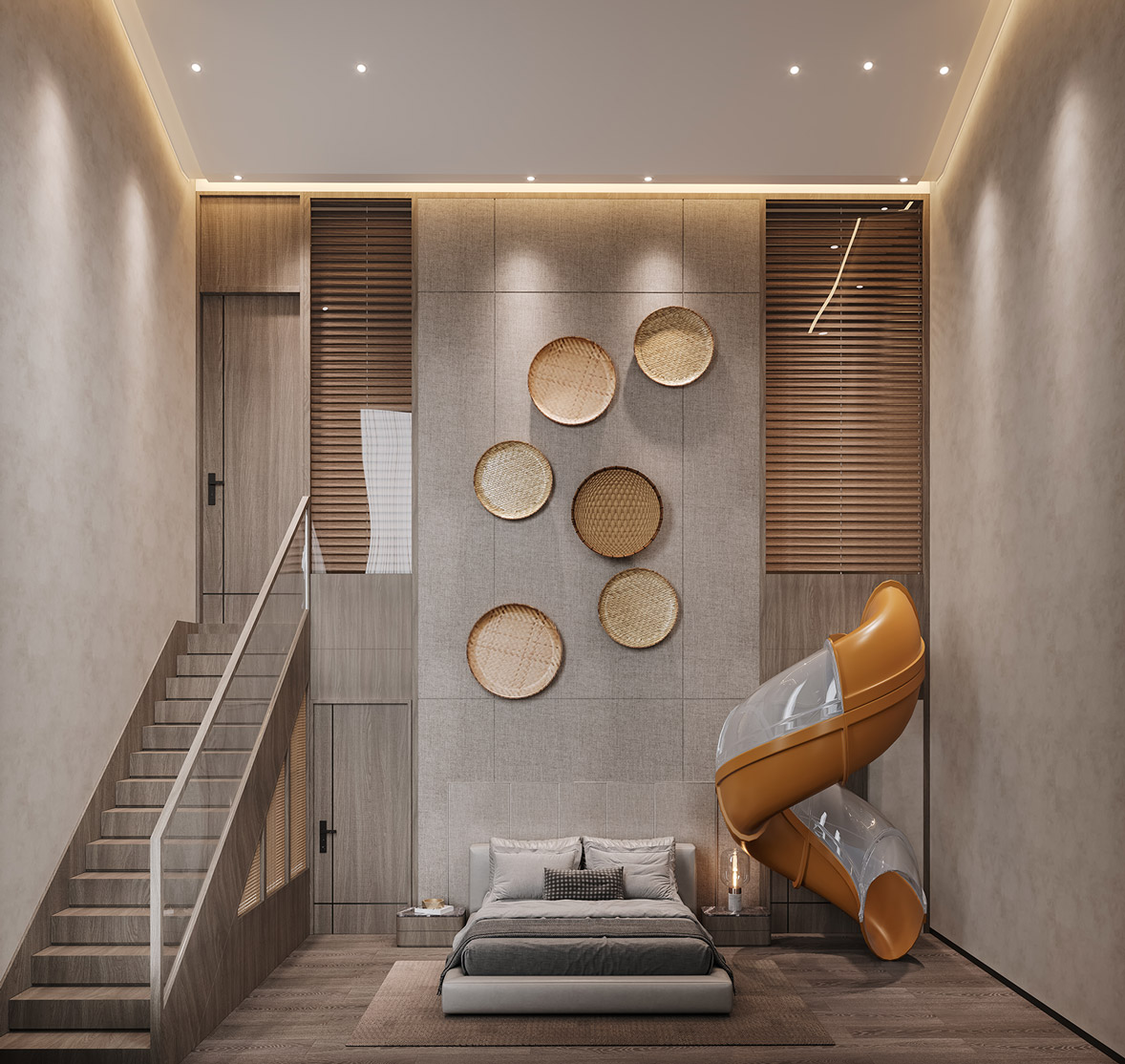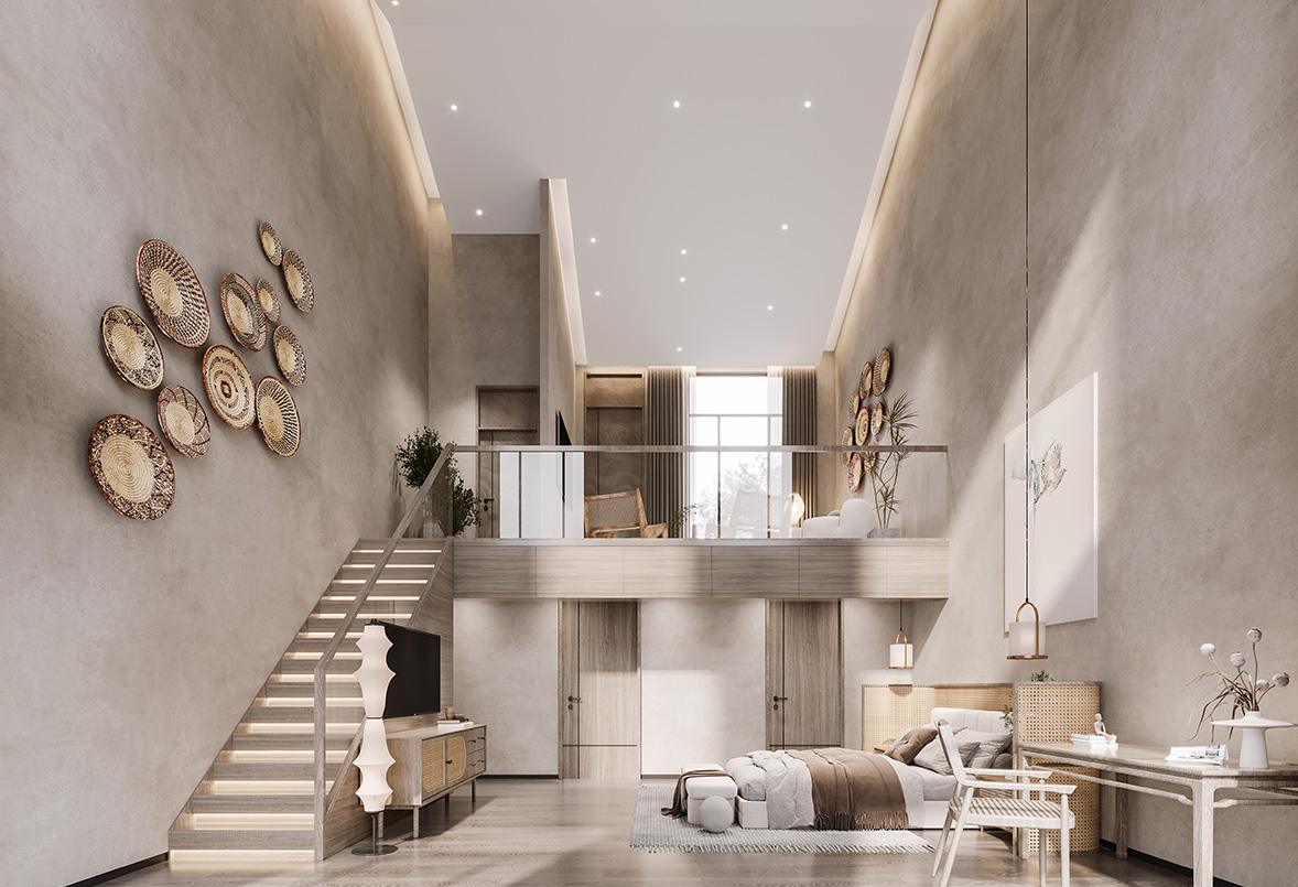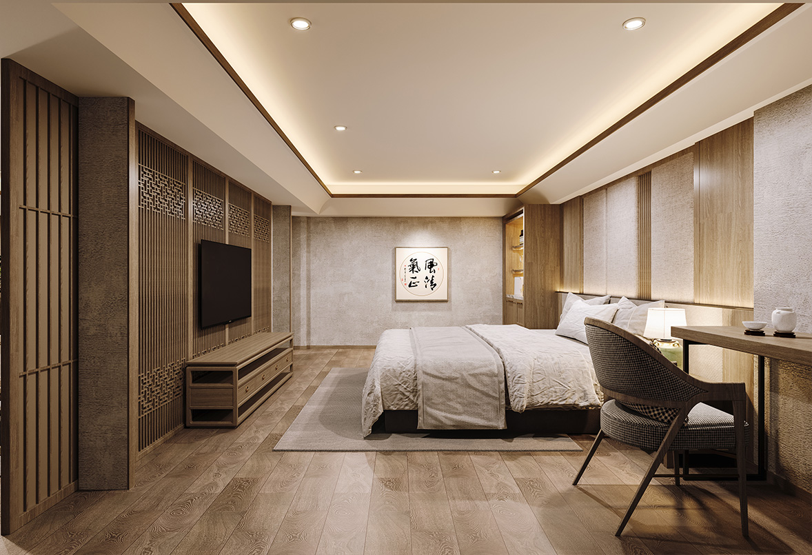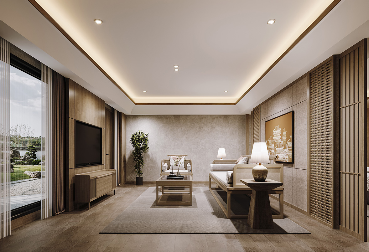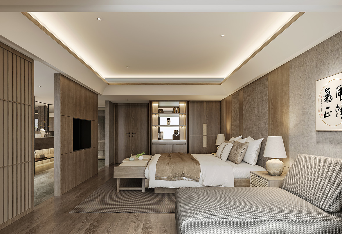 牆面做(zuò)法相對(duì)簡約,在材質選擇更加偏向于原木(mù)色,簡約中同樣融入編織的(de)地毯和(hé)古樸的(de)擺件,自然中也(yě)有韻味