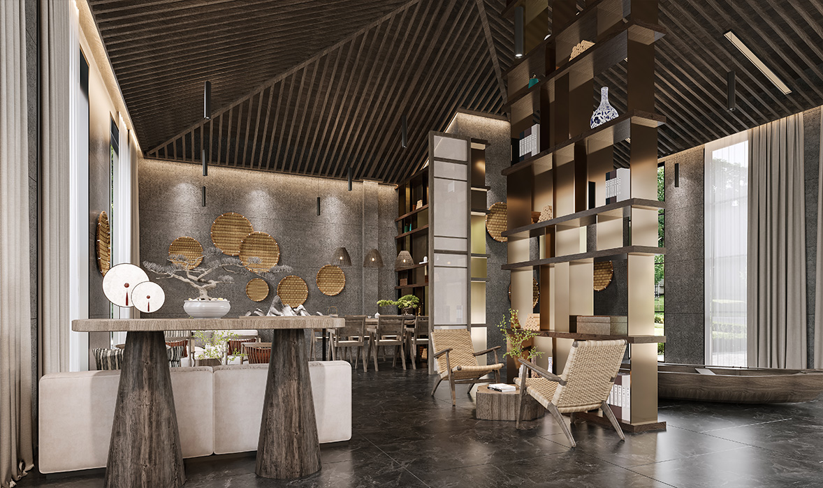 通(tōng)過蚝殼牆、矽藻泥、舊(jiù)石條、原木(mù)、編制網等質樸的(de)材質融入,來(lái)讓空間更具特色和(hé)情懷。