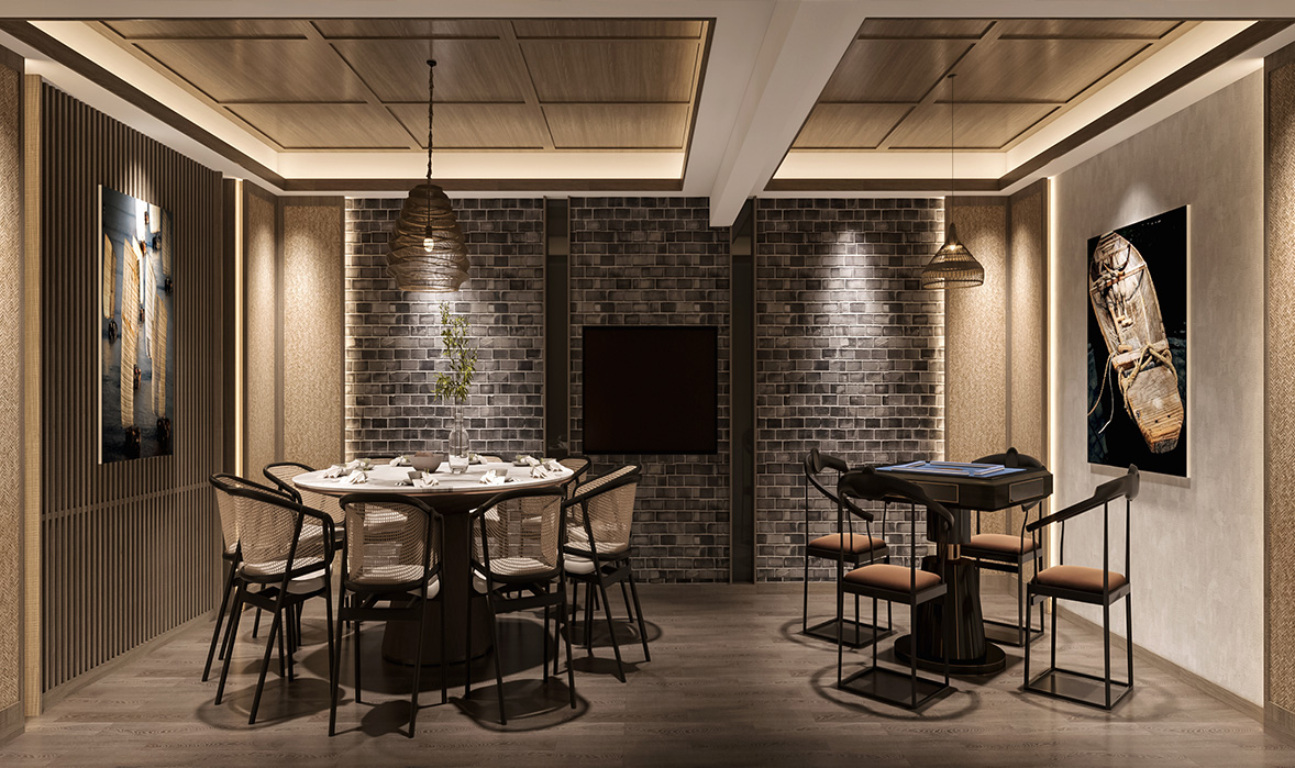在疍家漁民和(hé)海文化(huà)中尋找設計元素,漁船的(de)古木(mù)、船帆、漁民的(de)草(cǎo)帽、海邊鵝卵石等,讓傳統文化(huà)的(de)味道彌漫在空間每一處。